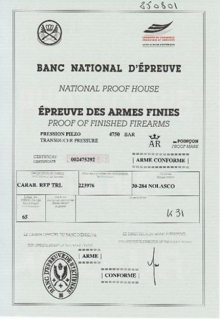 Arme éprouvée CIP S par le Banc National d'Epreuve de Saint-Etienne.