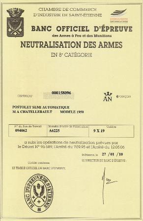Arme livrée avec le certificat de neutralisation de Saint-Etienne + Une facture.