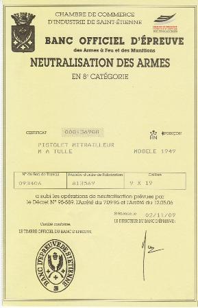 3) Arme de fabrication des années 1950 - Version neutralisation Saint-Etienne de décembre 2014 Prix : 400 € + 20 € de port.